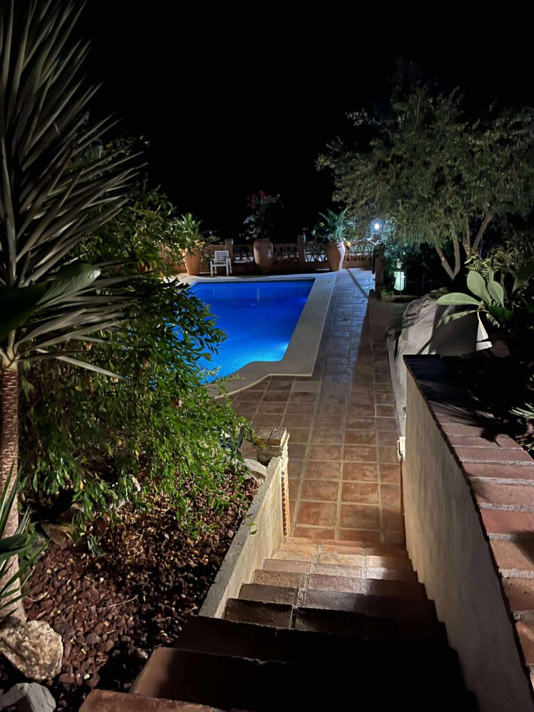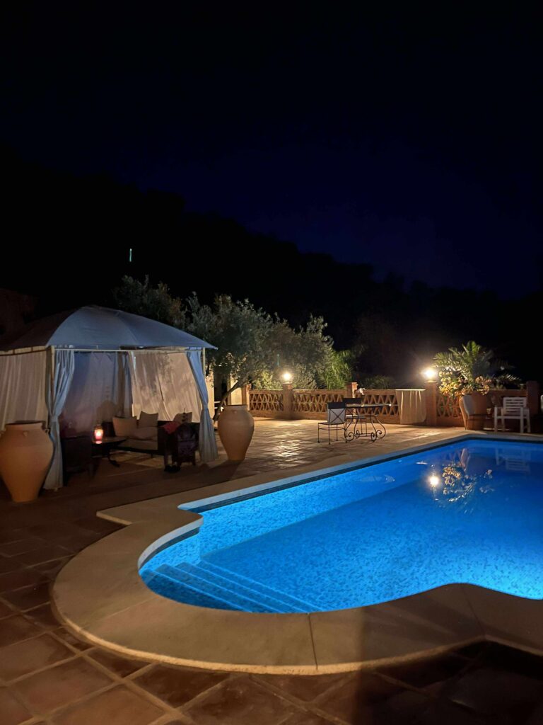 Boendet är ingen vanlig hotellvistelse. Det är ett privat hus som ägarna under många år byggt upp till en riktig oas. Huset har flera sovrum, gemensamma ytor, pool och en omgivning full av olivträd, mangoträd, lime och blommande buskar. Maten lagas på plats och serveras med omtanke — enkelt, gott och med känsla för det lokala. Allt är nära och avslappnat.